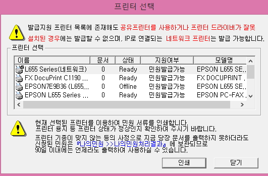 프린터 선택이 나오는데, 여기서 이미 설치된 프린터에 민원발급가능이라고 되어 있습니다. 선택하시고 발행을 누르시면 인쇄가 되겠지만, 여러분은 실제로 인쇄는 되지 않습니다. 오류가 나겠죠. 실제 프린터가 연결되지 않았으니까요.