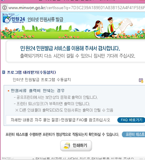 이제 다 되었습니다. 다시 민원24로 돌아가서 문서출력을 눌러주세요. 그러면 아래와 같이 인쇄할 수 있는 창이 새롭게 생성됩니다. 인쇄를 누르세요.