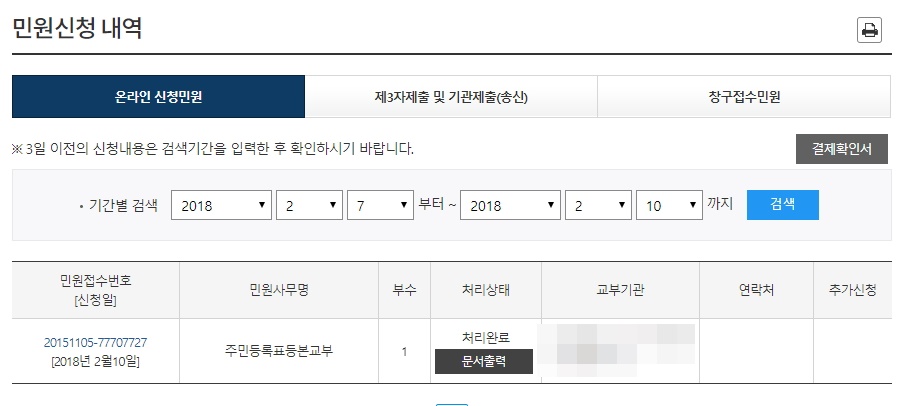 그러면 아래와 같이 민원신청내역이 나오면서 서류를 출력할 수 있게 됩니다. 프린터가 연결되어 있다면 문서출력 버튼을 누르시고 출력하시면 됩니다.