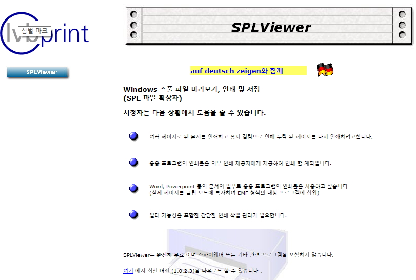 프린터 드라이버를 설치하셨거나 이미 프린터 드라이버가 설치가 되어 있으시면, 다음 순서로 SPLviewer라는 프로그램을 설치하셔야 합니다. 약간 번거롭기는 해도 이 프로그램이 있어서 pdf파일을 저장할 수 있으니 양해해 주시기 바랍니다. SPL viewer라는 프로그램은 프린터 스풀 파일을 볼수 있는 프로그램입니다. 이 프로그램으로 pdf 파일을 저장할 수 있습니다. 아래의 링크를 클릭하셔서 다운로드하시면 됩니다.