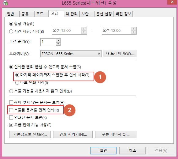 위를 보시면 첫번째로 마이막 페이지까지 스풀한 후 인쇄 시작에 체크해 주시고, 두번째로 스풀된 문서를 먼저 인쇄를 체크해제해 주세요. 그리고 확인 버튼을 눌러서 설정해 줍니다.