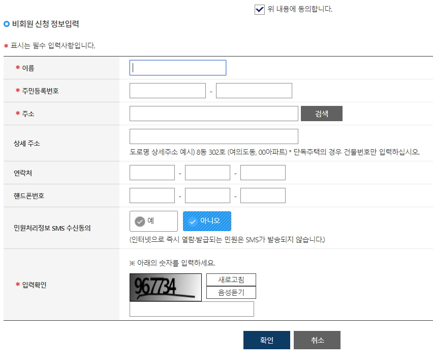 연락처는 굳이 적지 않으셔도 됩니다. 이름, 주민번호, 주소, 입력확인의 숫자만 입력하신 후 확인 버튼을 눌러주세요.